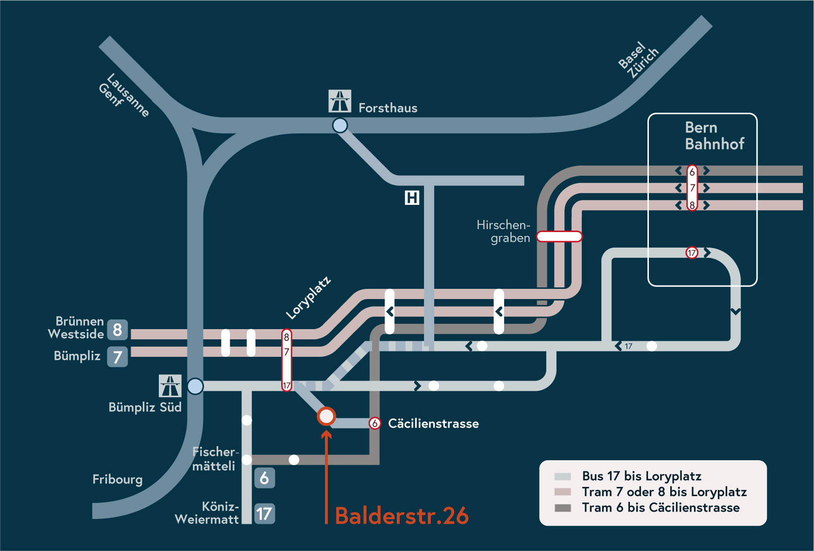 Mit Tram 7 (Bümpliz) oder 8 (Brünnen Westside) bis Haltestelle Loryplatz. Von da 5 Min. zu Fuss
